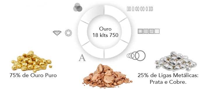 Nada mais é do que o ouro puro (24k) unido a outros metais mais resistentes, como a prata e cobre, deixando assim o ouro mais consistente e ideal para jóias. O ouro puro (24k) é um metal mole, por isso é necessário o acréscimo das ligas metálicas para dar rigidez ao metal, evitando assim que ele amasse com facilidade. A proporção do ouro 18k é a seguinte:
